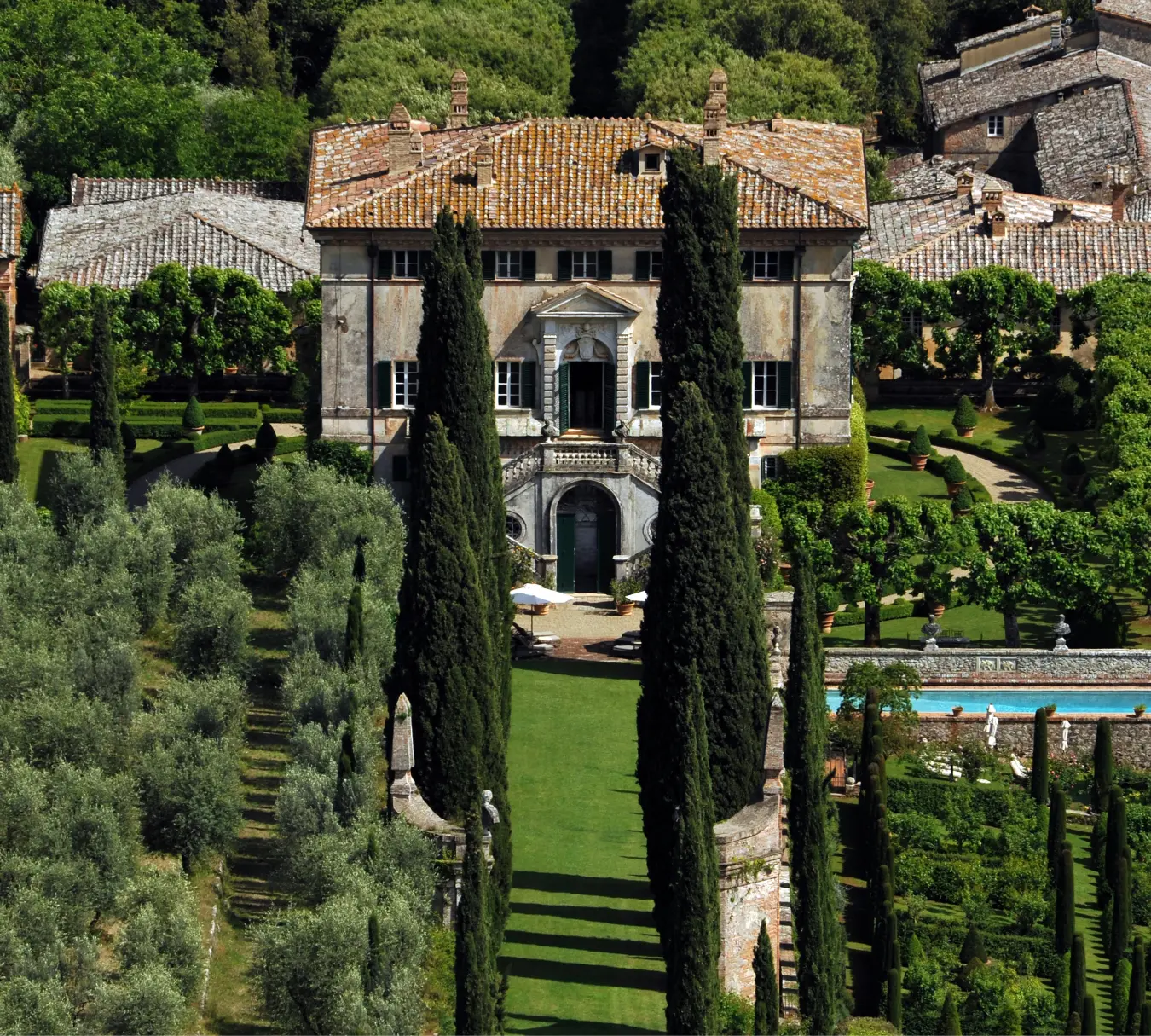 L’atmosfera della villa è romantica e senza tempo: eleganti sale con affreschi antichi e arredi d’epoca si alternano a loggiati e terrazze che si affacciano su giardini all’italiana perfettamente curati.